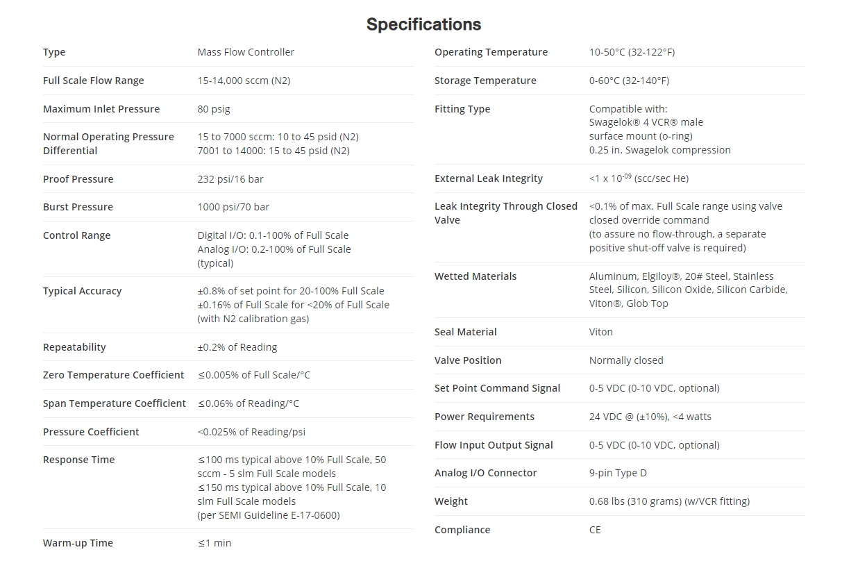 MKS C-Series Compact, Ultrafast Mass Flow Controllers CMA10B 15-14,000 sccm Compact, Fast Response Mass Flow Controller