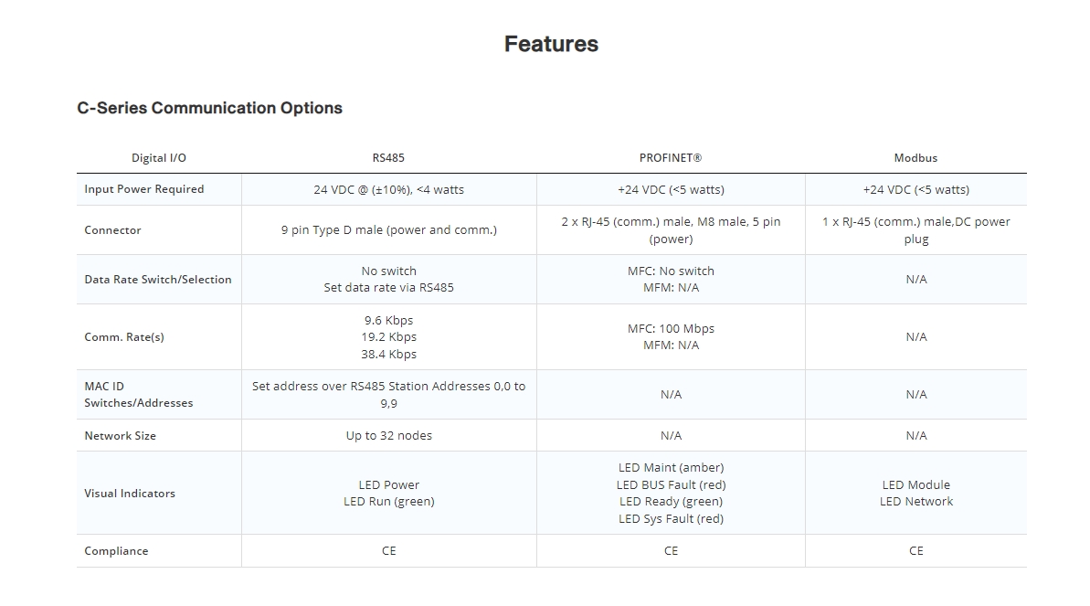 The CMA10B Mass Flow Controller (MFC) is a compact, fast-response model with a MEMS-based flow sensor for non-corrosive gas applications. It supports Full Scale flow rates from 15 to 14,000 sccm (N2) and a control range from 0.1% to 100% of Full Scale. Available as both a flow controller and a flow meter, it offers analog (0-5 VDC) or digital (RS485, PROFINET®, Modbus TCP/IP) communication interfaces and requires a 24 VDC power supply.