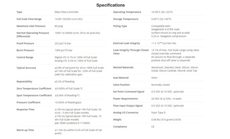 MKS C-Series Compact, Ultrafast Mass Flow Controllers CMA50A 14,000-50,000 sccm Compact, Fast Response Mass Flow Controller