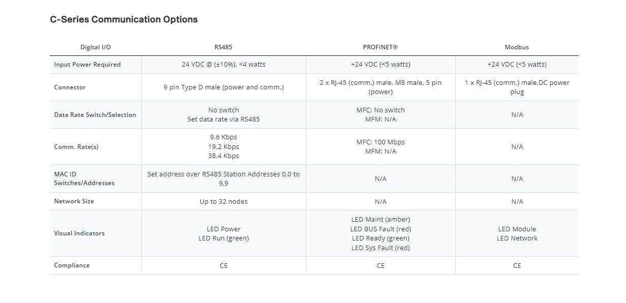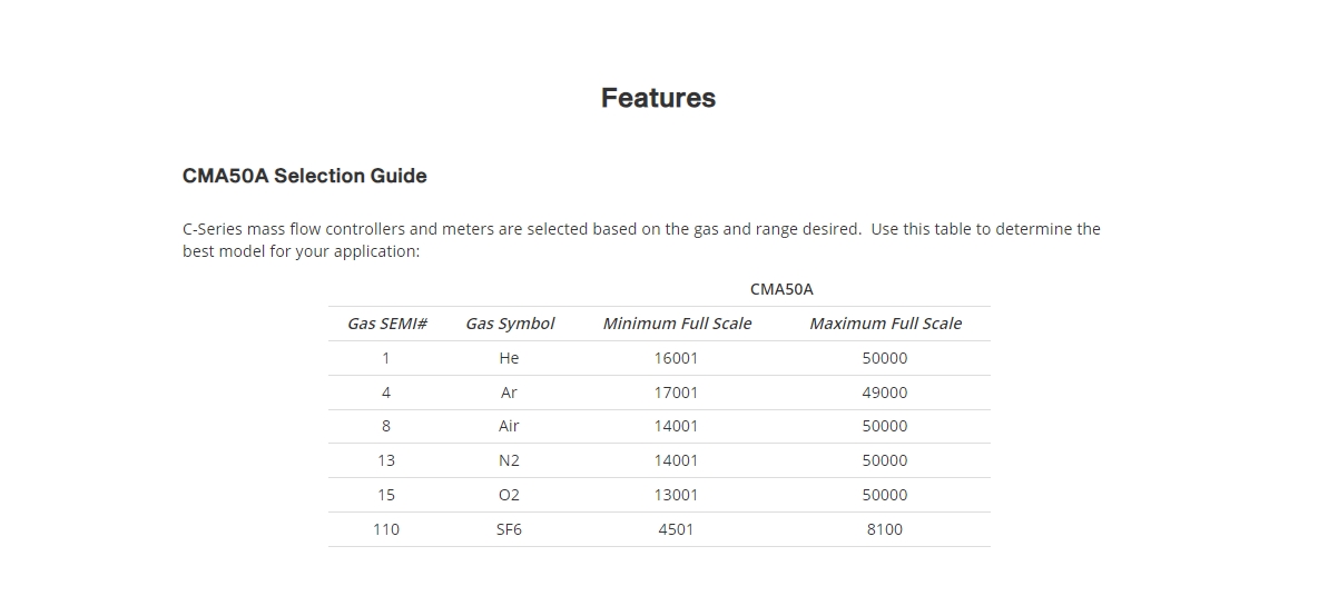 The C-Series CMA50A Mass Flow Controller (MFC) is a compact, fast-response device using a MEMS-based flow sensor for non-corrosive gas applications. It offers Full Scale flow rates from 14,000 to 50,000 sccm (N2) and a control range from 0.1% to 100% of Full Scale. Available as both a flow controller and a flow meter, it supports analog (0-5 VDC) or digital (RS485, PROFINET®, Modbus TCP/IP) communication interfaces, requiring a 24 VDC power supply.
