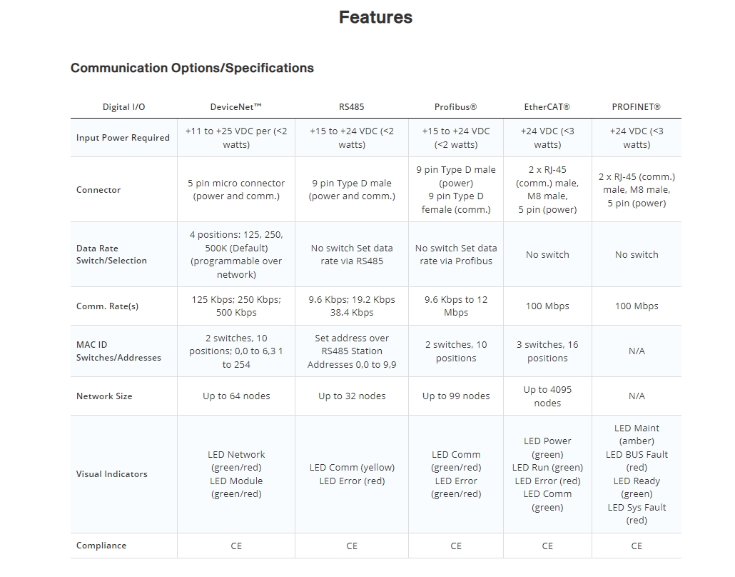 – Various digital (EtherCAT, DeviceNet™, Profibus®, PROFINET, RS485) or analog (0-5 VDC, 4-20 mA) I/O options
