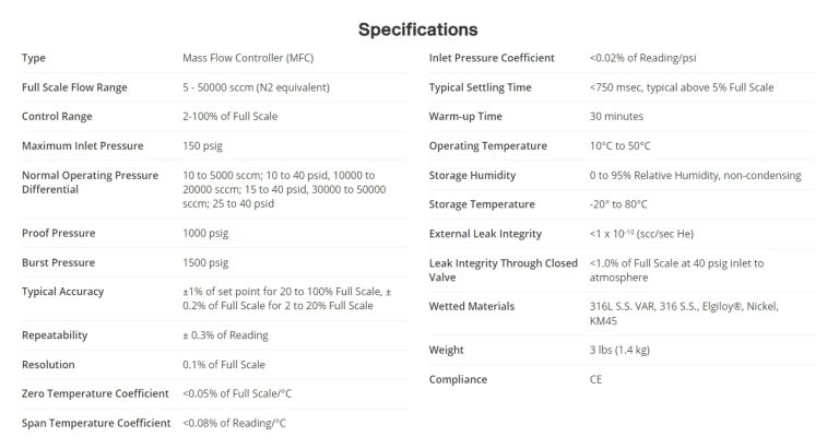 - Flow rates ranging from 5 to 50,000 sccm (standard cubic centimeters per minute)
