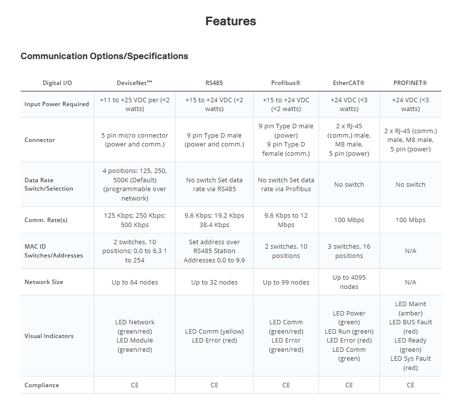 - Wide choice of digital I/O options, including EtherCAT, DeviceNet™, Profibus®, PROFINET, and RS485, or analog I/O options