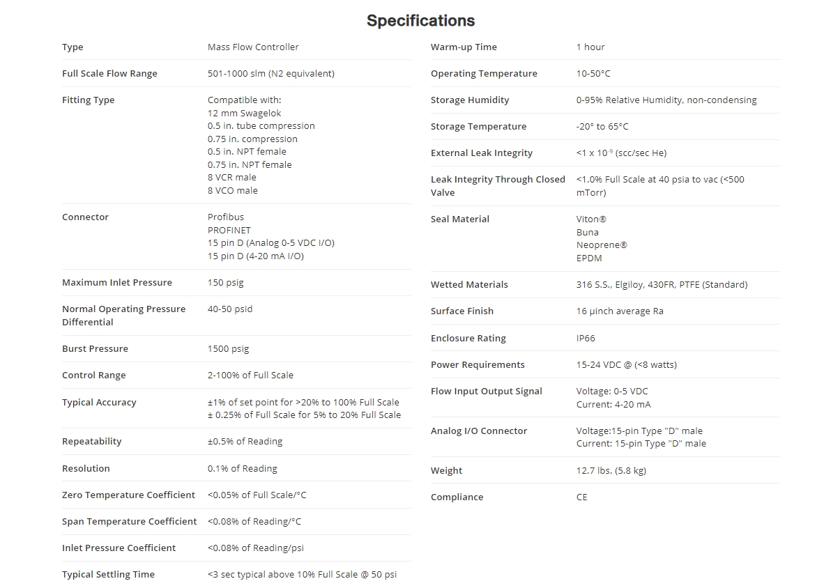 The IE1000A MFC offers a broad flow range from 501 to 1000 slm, making it suitable for high flow applications. Its unique control valve design enables rapid response to set point changes while maintaining closed conductance leak rates significantly lower than other high flow mass flow controllers.