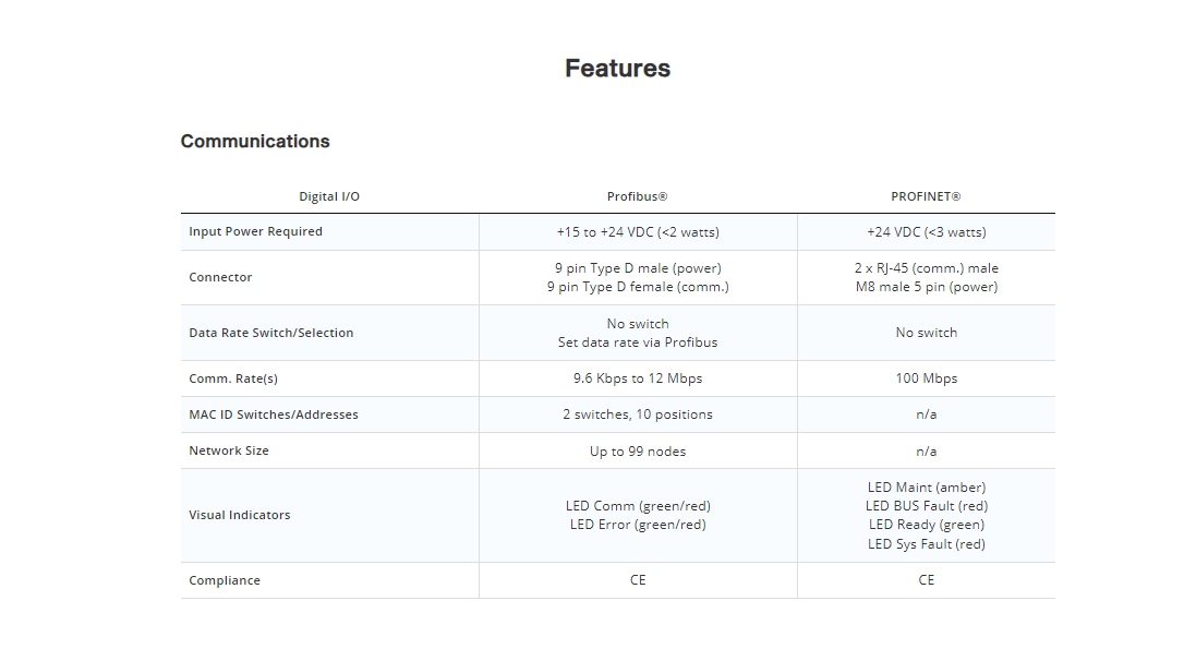 - Multiple I/O options including analog, RS485, Profibus™, or DeviceNet™