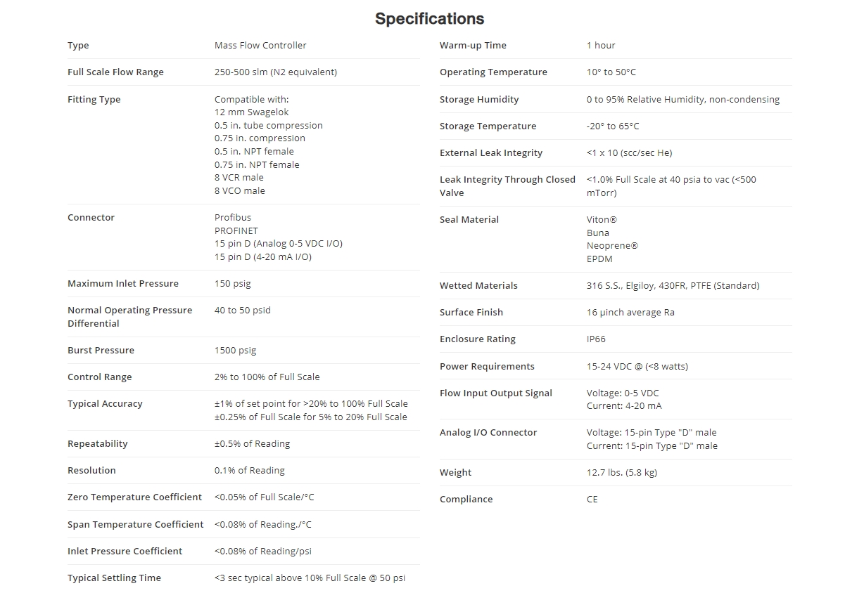The IE500A MFC offers a broad flow range from 250 to 500 slm, making it suitable for high flow applications. Its unique control valve design enables quick response to set point changes while maintaining closed conductance leak rates that are significantly lower compared to other high flow mass flow controllers.
