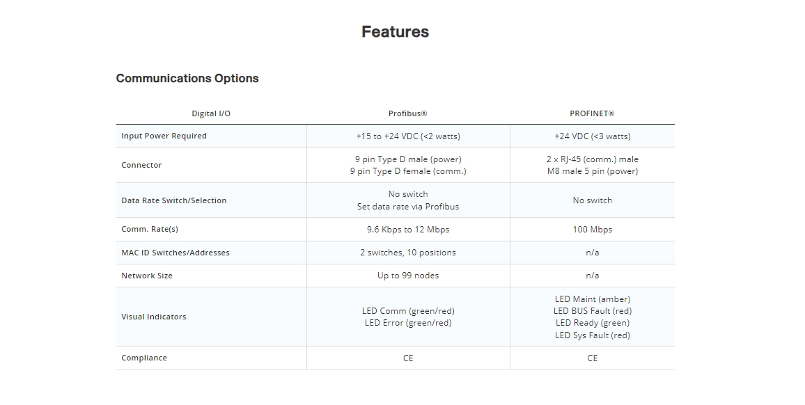 - Multiple I/O options including analog, RS485, Profibus™, or DeviceNet™